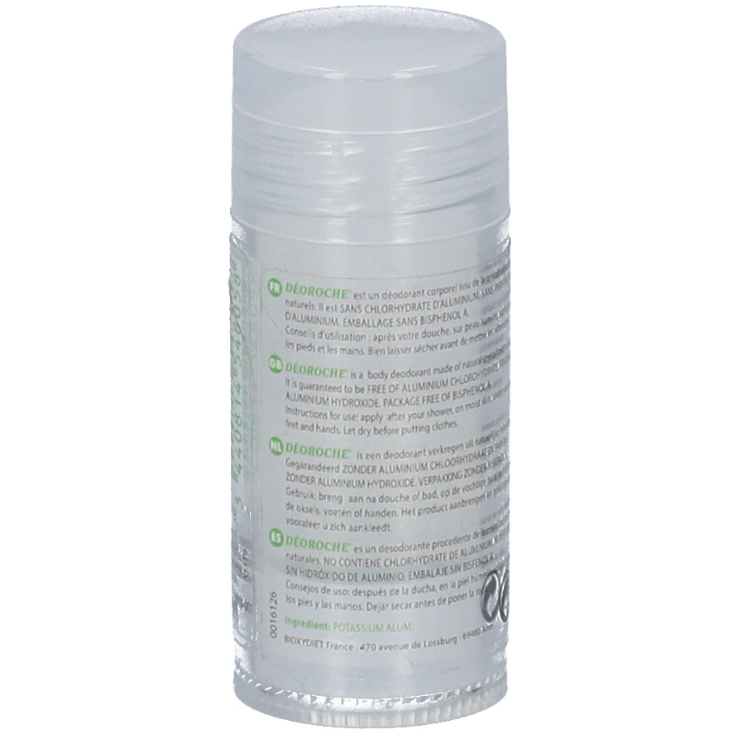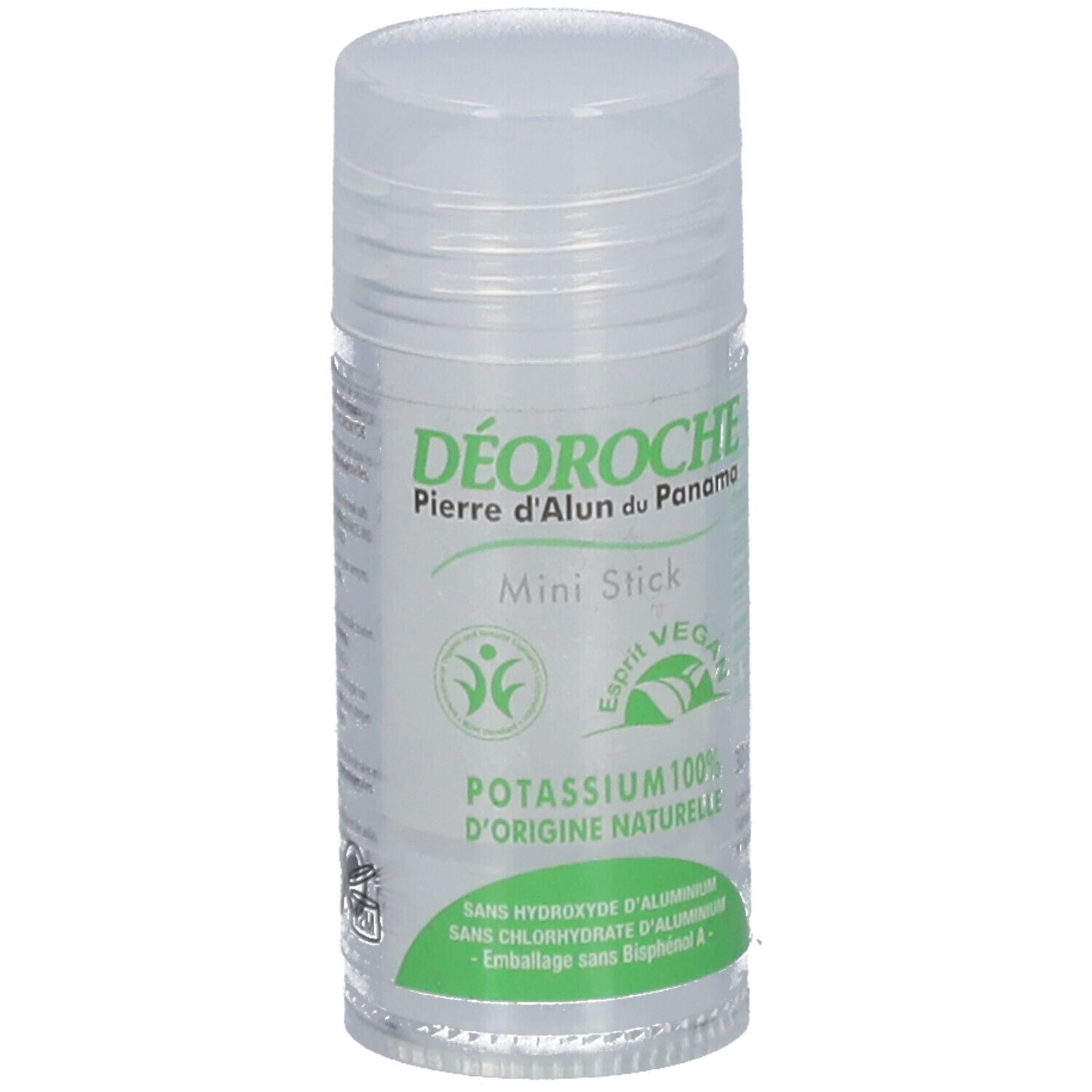 La pierre d'alun est un minéral translucide, totalement naturel, sans parfum ni alcool. Déoroche ne couvre pas l'odeur de la transpiration, mais dépose un film invisible de sels minéraux qui régule les sécrétions tout en laissant la peau respirer.