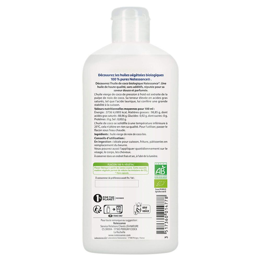 L’huile de coco vierge Natessance est 100 % pure, issue de l’agriculture biologique et obtenue par première pression à froid. Naturellement riche en acide laurique, elle présente une grande affinité avec la fibre capillaire : elle nourrit, lisse, restructure et protège les cheveux tout en leur apportant éclat et brillance. Son parfum naturel agréable et sa texture fondante à température ambiante en font un soin idéal pour toute la famille. Polyvalente, elle convient également à un usage alimentaire.