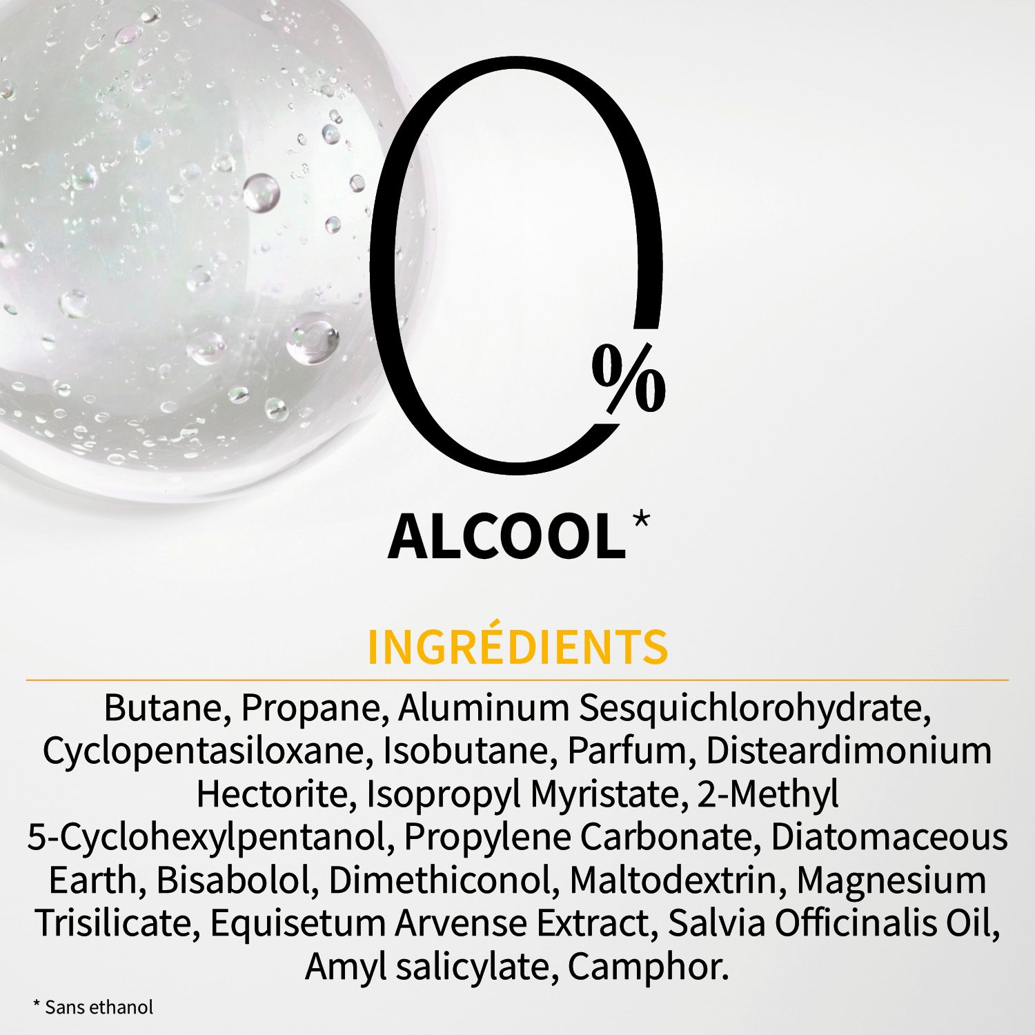 BUTANE, PROPANE, ALUMINUM SESQUICHLOROHYDRATE, CYCLOPENTASILOXANE, ISOBUTANE, PARFUM,DISTEARDIMONIUM HECTORITE, ISOPROPYL MYRISTATE, 2-METHYL 5-CYCLOHEXYLPENTANOL, PROPYLENE CARBONATE, DIATOMACEOUS EARTH, BISABOLOL, DIMETHICONOL, MALTODEXTRIN, MAGNESIUM.