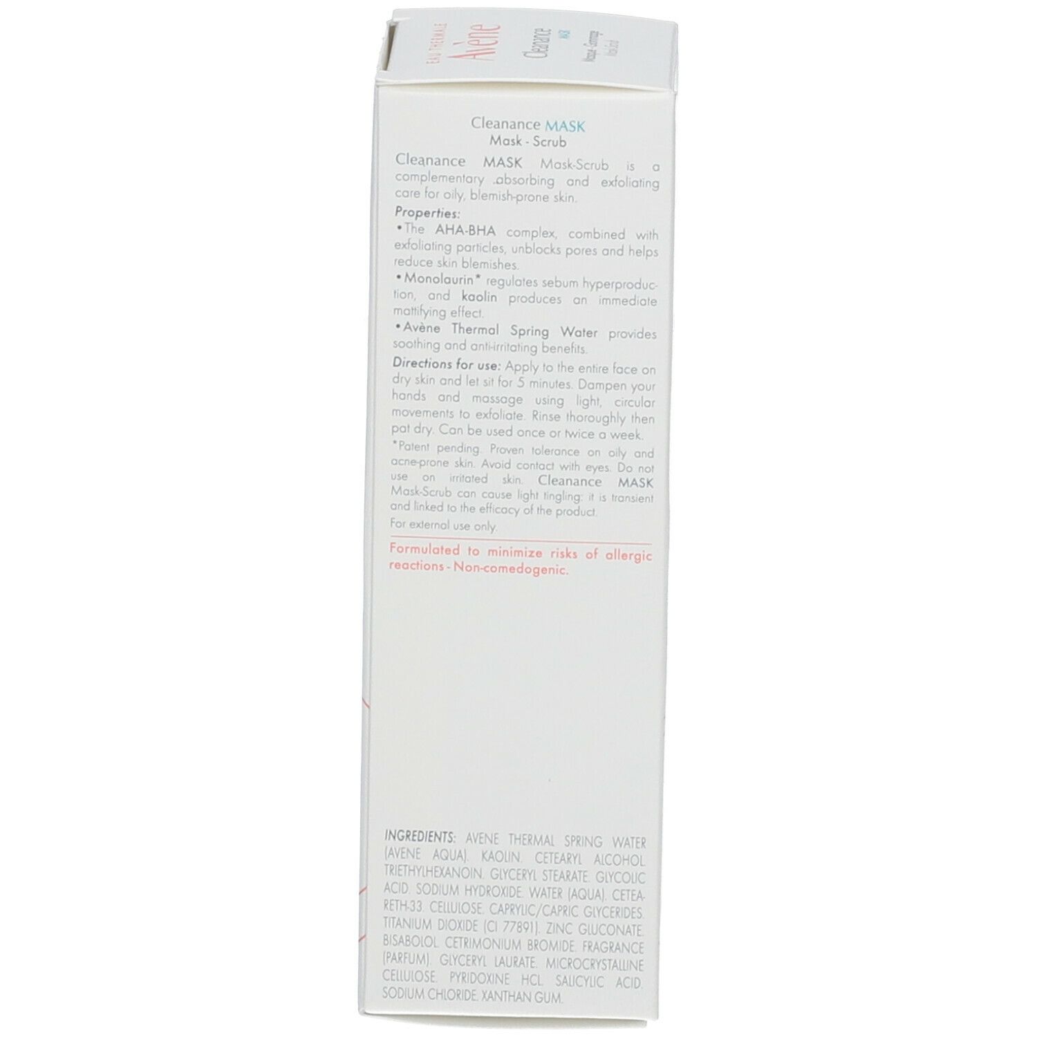 AVENE THERMAL SPRING WATER (AVENE AQUA). KAOLIN. CETEARYL ALCOHOL. TRIETHYLHEXANOIN. GLYCERYL STEARATE. GLYCOLIC ACID. SODIUM HYDROXIDE. WATER (AQUA). CETEARETH-33. CELLULOSE. CAPRYLIC/CAPRIC GLYCERIDES. TITANIUM DIOXIDE (CI 77891). ZINC GLUCONATE. BISABOLOL. CETRIMONIUM BROMIDE. FRAGRANCE (PARFUM). GLYCERYL LAURATE. MICROCRYSTALLINE CELLULOSE. PYRIDOXINE HCL. SALICYLIC ACID. SODIUM CHLORIDE. XANTHAN GUM.