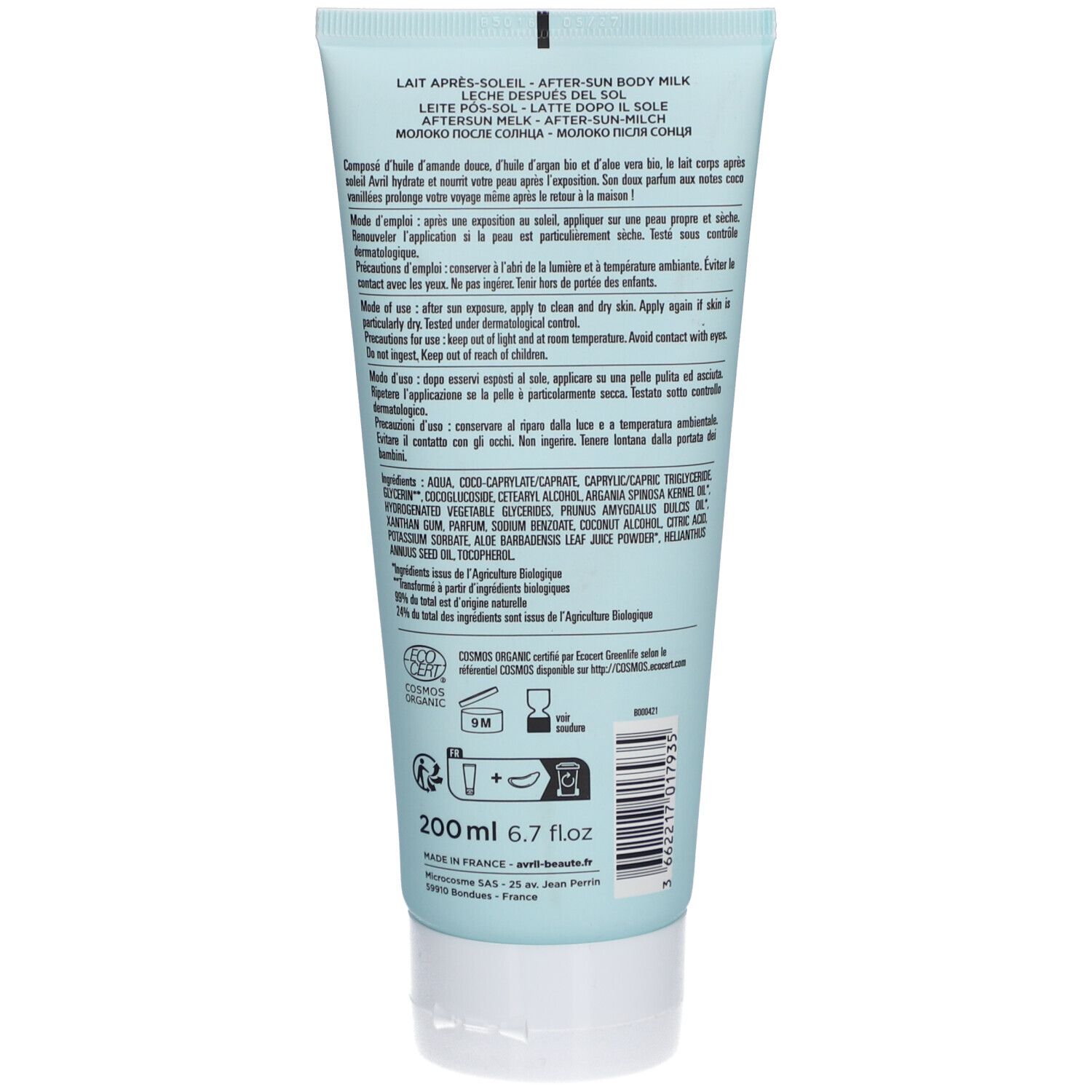 Formulé à partir d'huile d’amande douce bio, d'huile d’argan bio et d'aloe vera bio, le lait après soleil certifié bio Avril hydrate et apaise votre peau après l'exposition. Son doux parfum aux notes coco vanillées prolonge votre voyage même après le retour à la maison !
