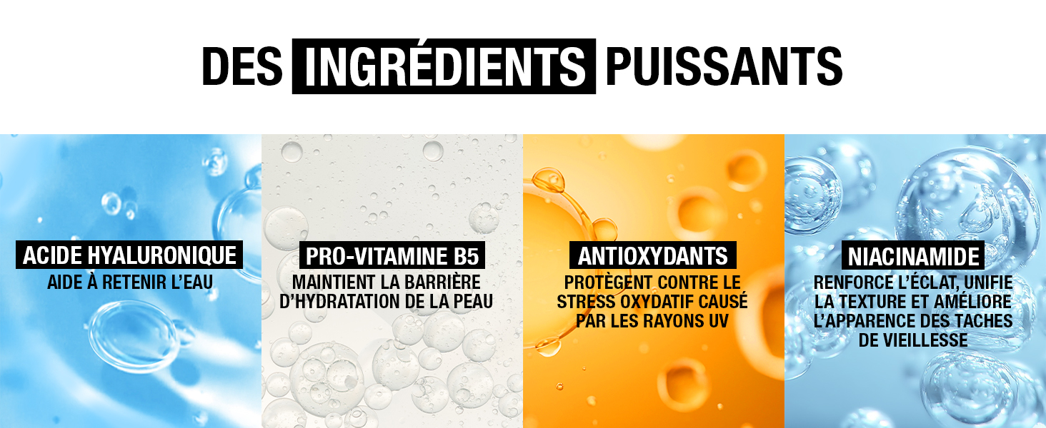 •Formule riche : Acide hyaluronique pour une hydratation intense, provitamine B5 pour maintenir la barrière d'hydratation, et 2 % de niacinamide pour un teint uniforme.