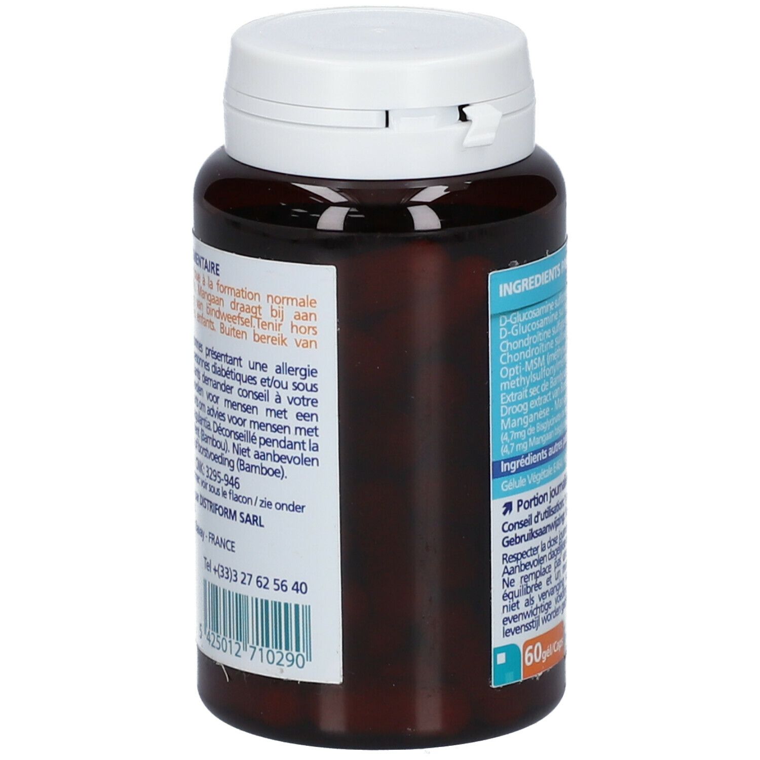 Association concentrée de D-Glucosamine Marine, Chondroïtine Marine, Silice, Opti-MSM (Méthylsulfonylméthane naturel de plantes) et Manganèse. Le Manganèse contribue à la formation normale des tissus conjonctifs. Deux gélules par jour procurent 75% de l’Apport de Référence en Manganèse. Formule sans agent de charge 100% à base de plantes et d’Actifs Naturels. Sans colorant de synthèse, sans gluten, sans conservateur ni arôme de synthèse.
