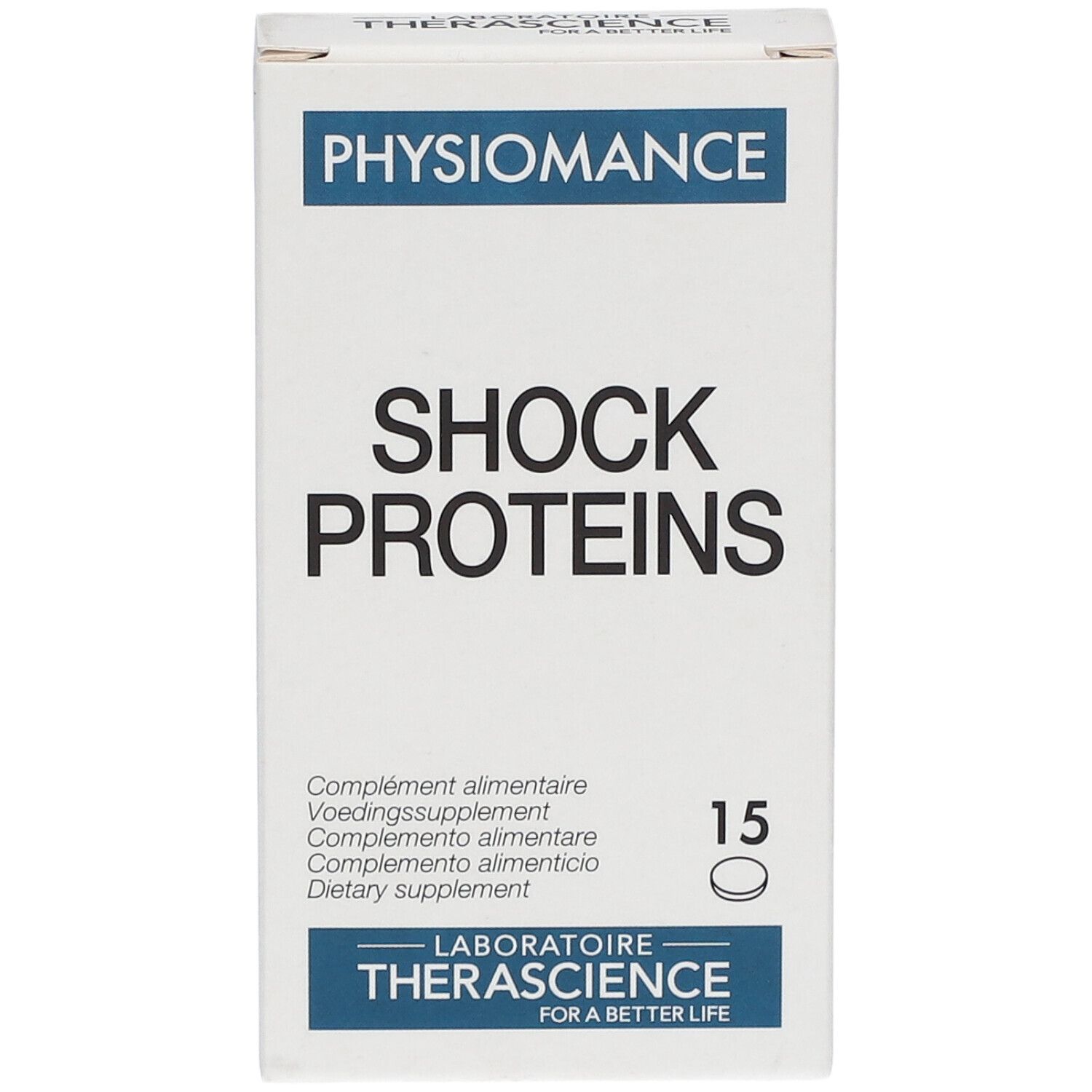 - Le stress, quelle qu’en soit la cause, nutritionnelle, biochimique, bactériologique, virale, thermique, psychologique, environnementale, agresse en permanence nos cellules et menace notre équilibre. Pour permettre la survie des cellules soumises à un état de choc, notre organisme a développé un mécanisme de protection face aux différents stress, en exprimant des protéines connues sous le nom de «protéines de choc thermique» ou «protéines de stress» (Heat Shock Proteins ou HSPs). Les protéines HSP sont des protéines ayant pour rôle de réparer les protéines endommagées suite à un stress cellulaire, permettant ainsi leur bon fonctionnement.PHYSIOMANCE SHOCK PROTEINS est idéal en accompagnement nutritionnel en situations de stress cellulaire, d'agressions cellulaires et d'état de choc.PHYSIOMANCE SHOCK PROTEINS apporte pour 3 comprimés :• 200,0 mg d'extrait de tige d'asperge ETASTM, inducteur de la synthèse des HSPs ;• 200,0 mg de HMB*, un des métabolites de la leucine qui eux-mêmes modulent la synthèse des HSPs ;• 15 mg de zinc, sous forme bisglycinate, inducteur de l’expression des HSPs 70.*HMB : calcium bêta-hydroxy-bêta-méthylbutyratePourquoi choisir PHYSIOMANCE SHOCK PROTEINS du Laboratoire THERASCIENCE ?• Pour sa formule associant 2 bio-actifs (ETASTM et HMB) et un oligo-élément (zinc) aux actions synergiques sur l'induction des HSPs ;• Pour son extrait d'asperge ETASTM, actif déposé, bénéficiant de nombreuses études cliniques sur l'induction des HSPs.ETAS™ is a registred trademark of Amino Up Co., Ltd., JAPAN
