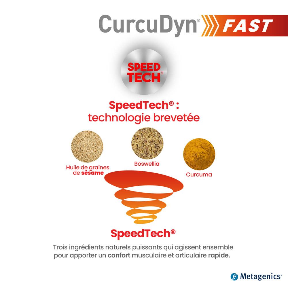 Complément alimentaire à utiliser dans le cadre d’une alimentation variée, équilibrée et d’un mode de vie sain.Curcudyn Fast- Mélange unique de Rhuleave K®, un complexe exclusif d’ingrédients actifs, extrait de Curcuma Longa, extrait de Boswellia serrata et huile de sésame noir
