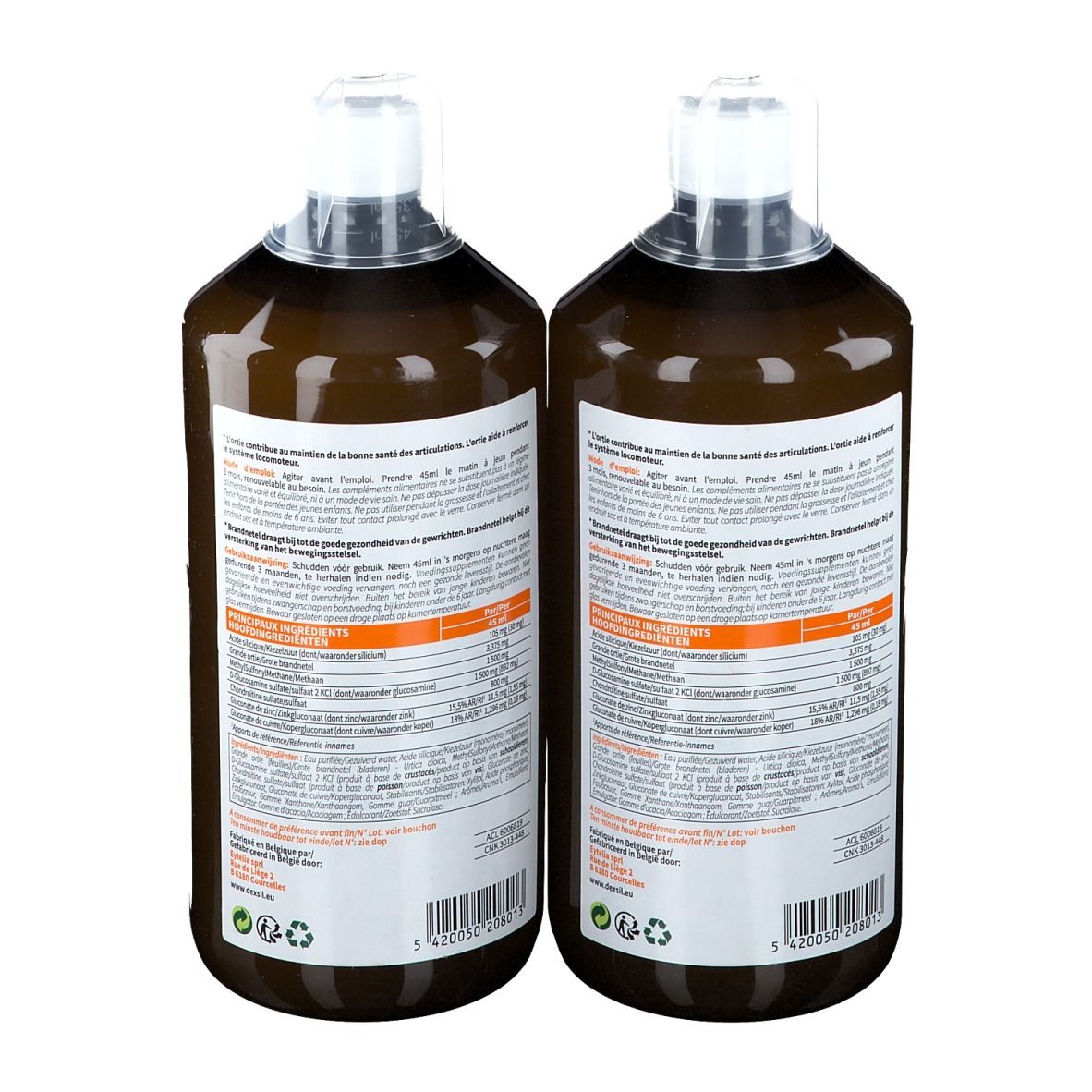 Eau purifiée, Acide silicique, Grande ortie (feuilles) - Urtica dioica, MethylSulfonylMethane, D-glucosamine sulfate (produit à base de crustacés), Chondroïtine sulfate (produit à base de poisson), Gluconate de zinc, Gluconate de cuivre, Stabilisants: Xylitol; Acide phosphorique; Gomme xanthane; Gomme guar; Arômes, Emulsifiant: Gomme d’acacia, Edulcorant: Sucralose.