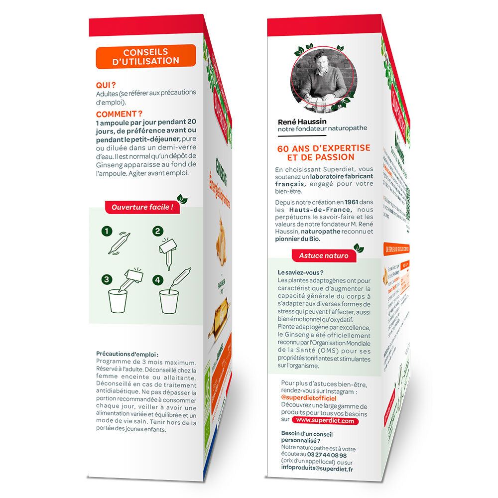 SUPERDIET - GINSENG BIO - Les propriétés adaptogènes du Panax Ginseng, surnommé "Racine de longue vie" en Corée, en font un allié pour contribuer à votre énergie physique et mentale, et soutenir votre organisme dans les périodes de fatigue et stress. Le Ginseng Panax est reconnu pour contribuer au tonus et à la vitalité, grâce aux ginsénosides qu’il contient. La teneur en ginsénosides augmentant en fonction de l’âge du Ginseng, Superdiet a sélectionné pour vous une racine de Ginseng de 6 ans d’âge. Pour vous permettre de profiter au mieux de ses propriétés stimulantes et tonifiantes, chaque ampoule de Panax Ginseng bio Superdiet contient 530 mg (équivalent en plantes sèches) de Ginseng, titré en ginsénosides à hauteur de 20 mg.