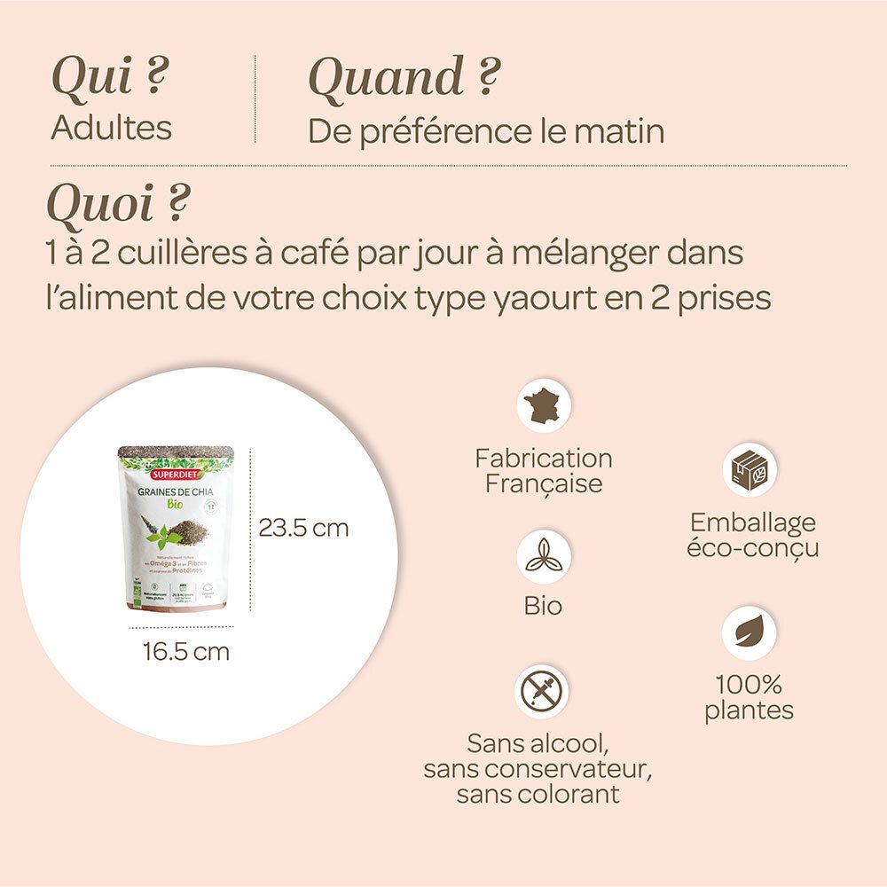 Les Graines de Chia Superdiet sont conservés dans un sachet papier recyclable et sont issus de l'agriculture biologique. Il suffit de saupoudrer 1 à 2 cuillère(s) à café sur vos plats ou à mélanger dans vos yaourts par exemple.