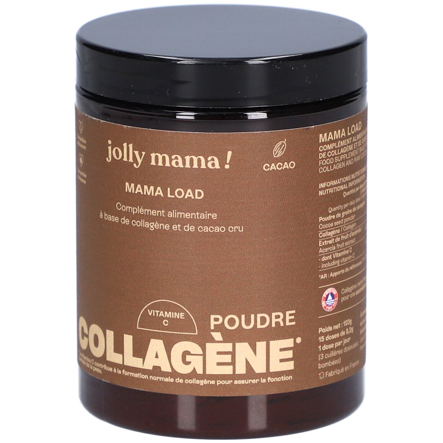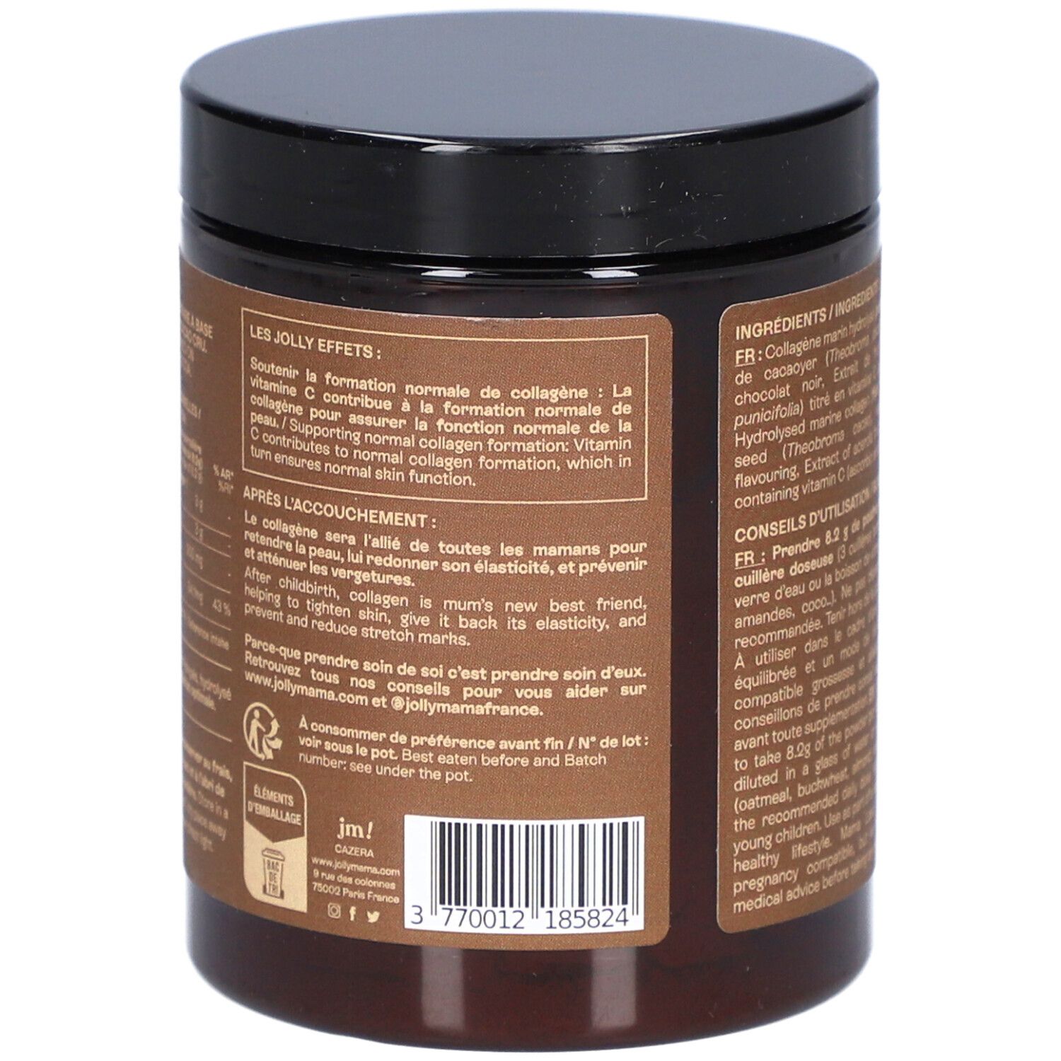 Collagène marin hydrolysé (POISSON), Poudre de graine de cacaoyer (Theobroma cacao), arôme naturel de chocolat noir, Extrait de fruit d'acérola (Malpighia punicifolia) titré en vitamine C (acide ascorbique).