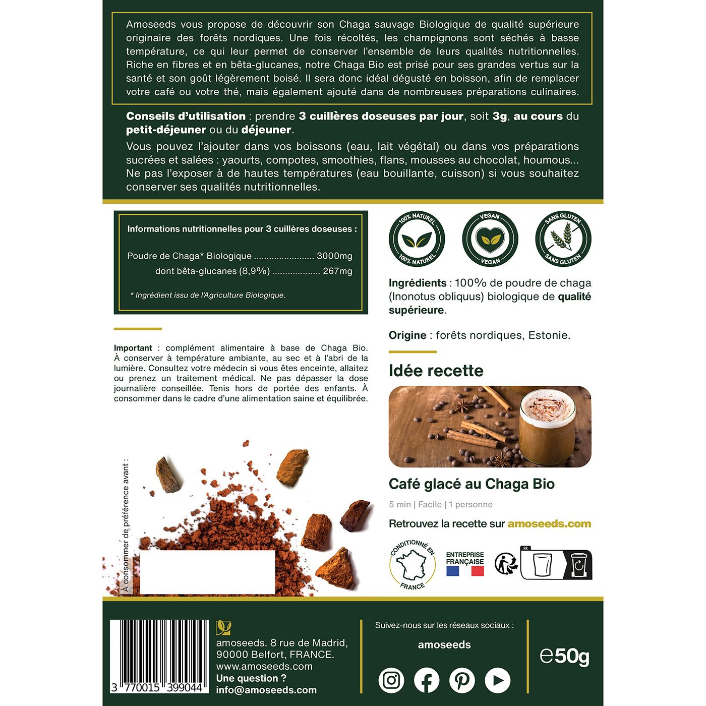 PUR, NATUREL : afin de vous offrir la plus haute qualité possible, nous prenons soin de sélectionner rigoureusement chacune de nos matières premières. C’est pourquoi nous avons choisi des champignons Chaga issus de l’Agriculture Biologique européenne, cultivés dans les forêts nordiques. Éloigné de toute pollution, notre Chaga se développe sur les bouleaux d’Estonie et est par conséquent d'une pureté incomparable.