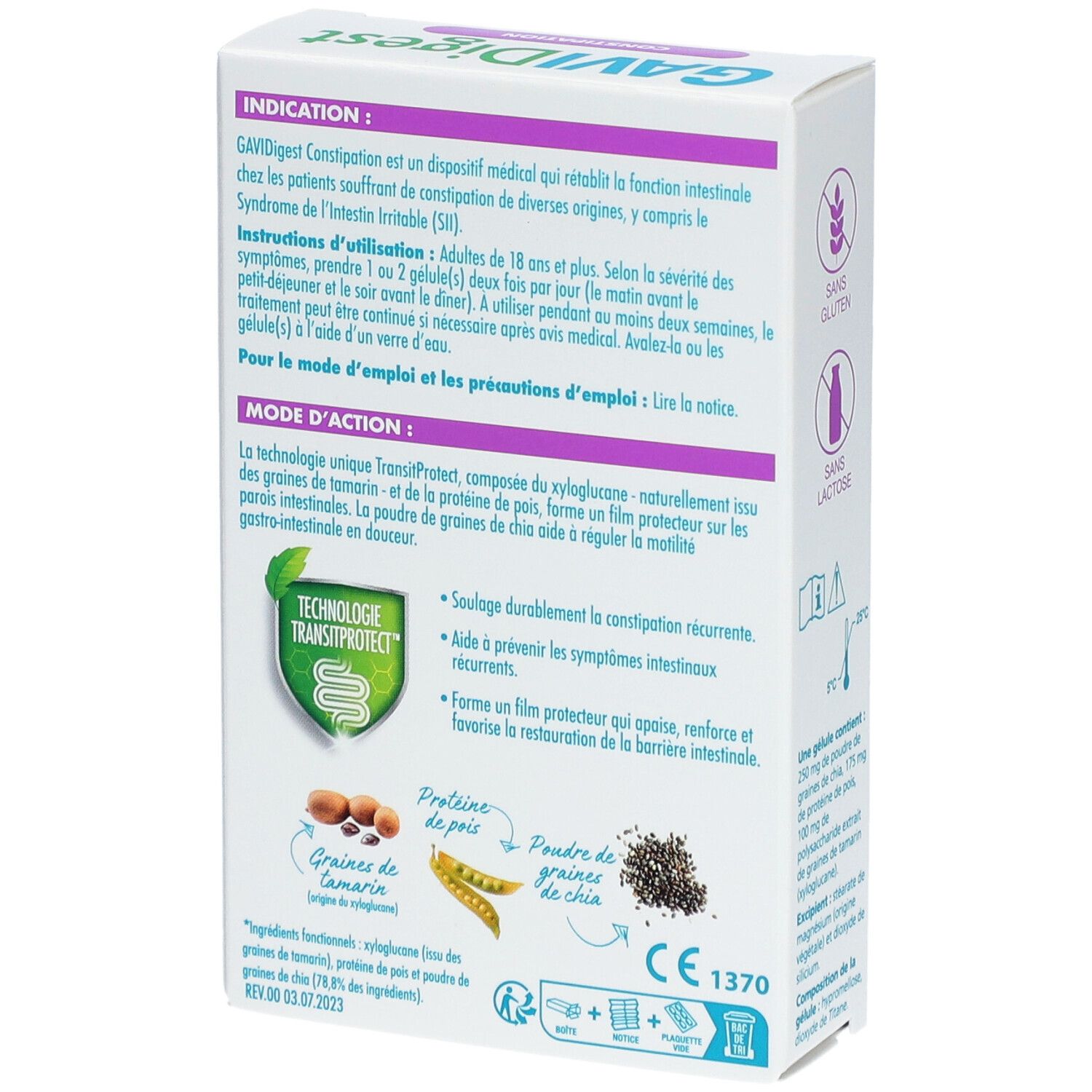 GAVIDigest Constipation est un dispositif médical qui rétablit la fonction intestinale chez les patients souffrant de constipation d’origines diverses, y compris le syndrome de l’intestin irritable. Il agit grâce à la technologie TransitProtect™ composée de xyloglucane, de poudre de graines de chia et de protéine de pois, qui forment un film protecteur sur la muqueuse intestinale.