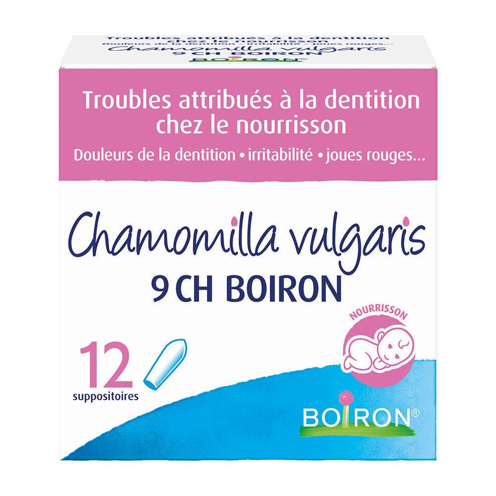 CHAMOMILLA VULGARIS 9 CH BOIRON, suppositoire est un médicament homéopathique traditionnellement utilisé dans les troubles attribués à la dentition chez le nourrisson (douleurs de la dentition, irritabilité, joues rouges, ...).