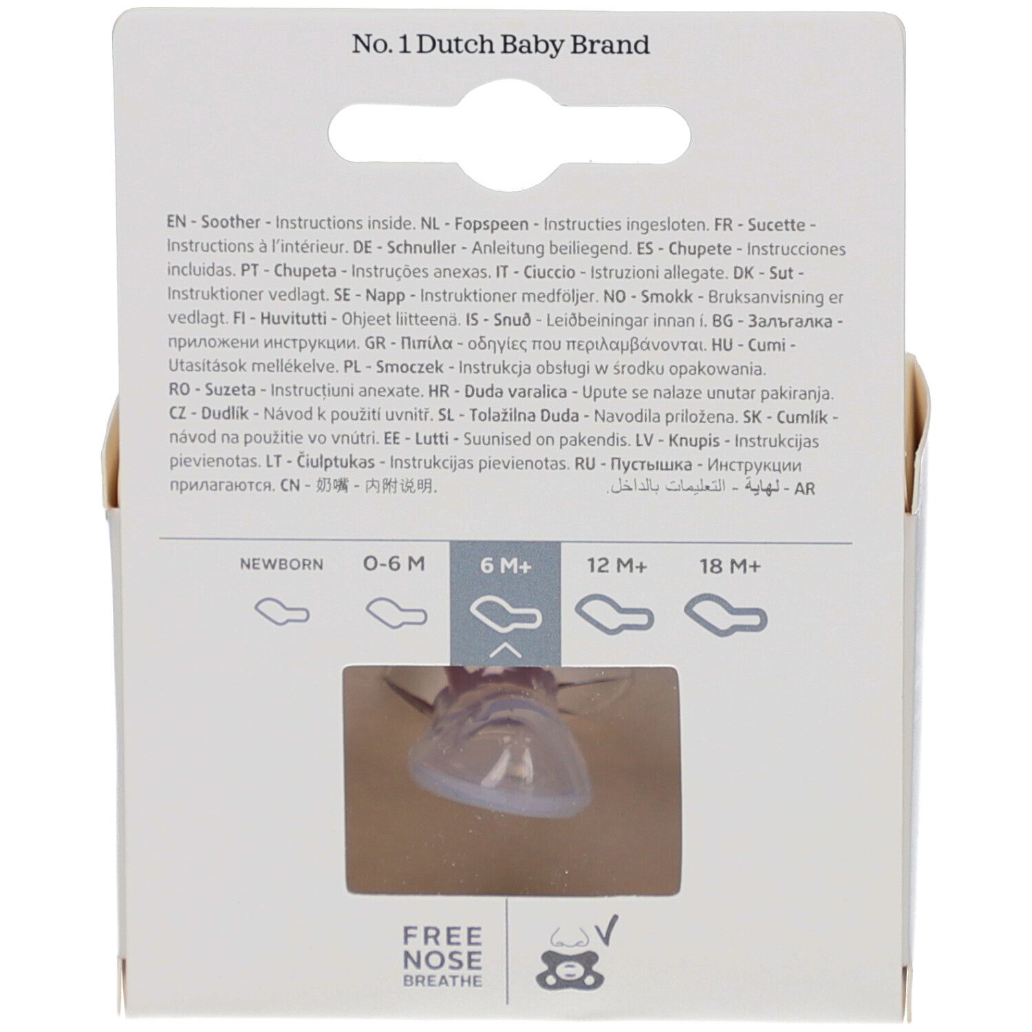 Les sucettes Difrax disposent d’une collerette en forme de papillon. Ainsi, le nez reste dégagé et la sucette épouse la forme du visage. Les trous dans la collerette permettent un apport en air supplémentaire et préviennent les irritations de la peau. La taille de la collerette a été choisie spécialement pour les bébés de 6 à environ 12 mois et est donc plus grande que la collerette des sucettes nouveau-né et 0-6 mois.