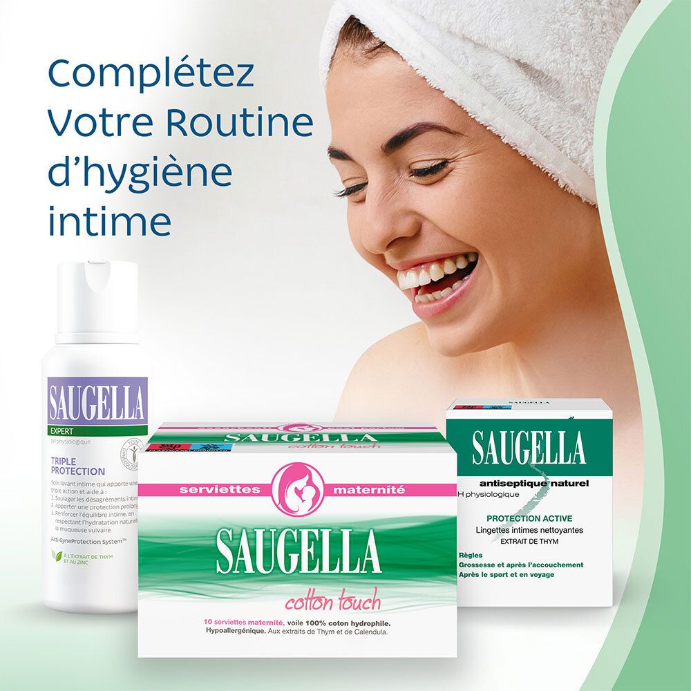 Enrichies en solution Saugella : Formulée avec des extraits de thym, de calendula et de l'acide cétoglutarique pour leurs effets anti-odeurs.