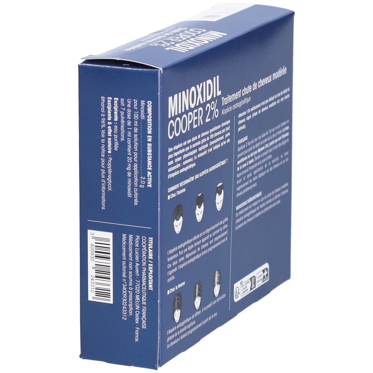 Le Minoxidil Cooper 2% traite la chute de cheveux modérée, ou alopécie androgénétique. Une alopécie androgénétique est une chute de cheveux quotidienne chronique plus importante que la normale (plus de cent cheveux par jour) sans raison physiologique expliquée (accouchement, perte saisonnière à l'automne et au printemps).