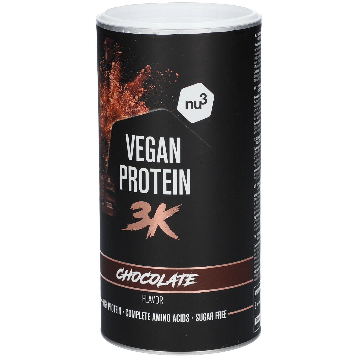 Vegan Protein de nu3 est un concentré de protéines végétaliennes goût chocolat contenant des édulcorants.
