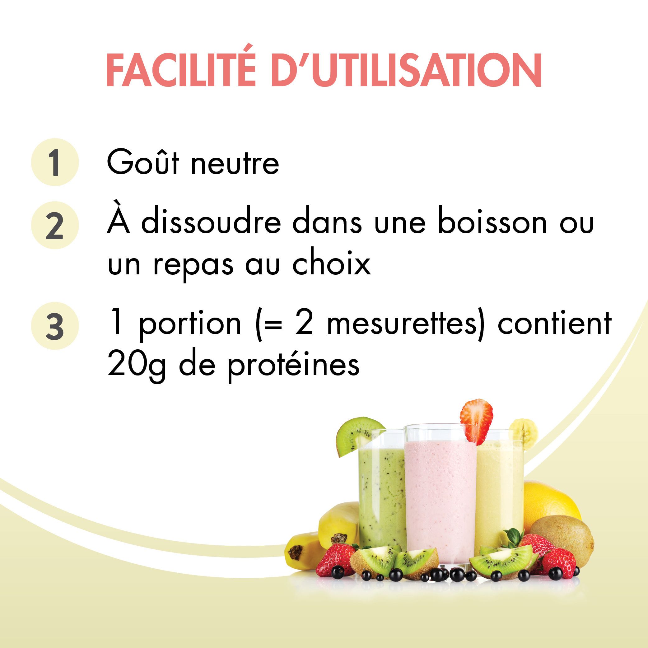 - Protéines sous une forme bien absorbée: isolat de protéine de petit-lait (20 g de protéines par portion)